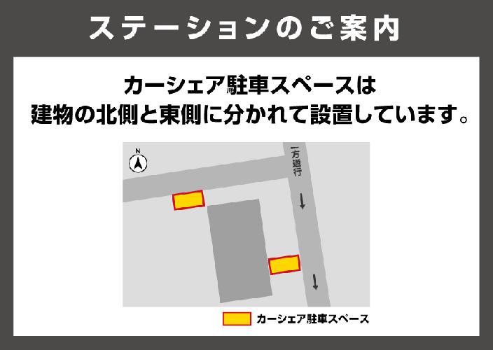 【ご案内】マンション「サンカトル」北側と東側の2ヶ所に分かれて設置しています。※当ステーションへの順路は、ステーションフォトギャラリーをご確認ください。
