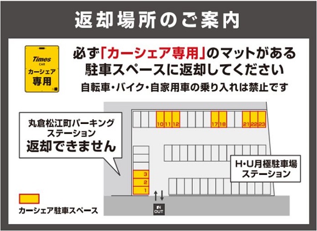 ※タイムズカー専用車室以外の他月極車室に誤って返却されるケースが増えております。必ずタイムズカー専用車室へのご返却をお願いいたします。アクトシティ「浜松市楽器博物館」の裏手にある月極駐車場No.1.2, 3, 10.11.12, 17.18, 21.22.23に設置。車の駐車位置が離れている為、ご注意ください。※当ステーションは、スタンド看板を撤去しております。返却車枠の間違いが多発しております。タイムズカー専用と書いてある車室へ返却ください。