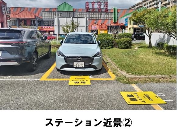 ※前方のラインをはみ出さないように駐車してください。※当ステーションへの順路は、ステーションフォトギャラりーをご確認ください。※当ステーションはスタンド看板を撤去しております。地下鉄箱崎線「箱崎九大前駅」より徒歩3分、マンション「クラシオン箱崎松原」の駐車場に設置しています。