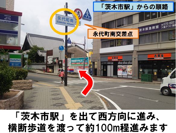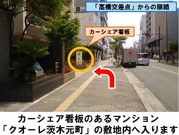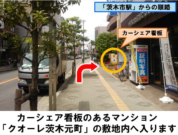 阪急京都本線「茨木市駅」より徒歩約4分、マンション「クオーレ茨木元町」の駐車場に設置しています。※当ステーションへの順路は、ステーションフォトギャラリーをご確認ください。※当ステーションは、スタンド看板を撤去しております。