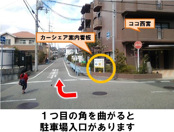 【ご注意】返却の際は隣接するお客様の迷惑とならないよう、専用駐車スペースの枠内に駐車してください。【マナーをお守りください】・車内で出たゴミは、必ず各自でお持ち帰りください。・ステーションへの自転車、バイクでの来場・乗り入れは禁止です。「青木交差点」より徒歩約5分、マンション「ココ西宮」の駐車スペースに設置しています。※当ステーションへの順路は、ステーションフォトギャラリーをご確認ください。※当ステーションは、固定式看板を設置しています