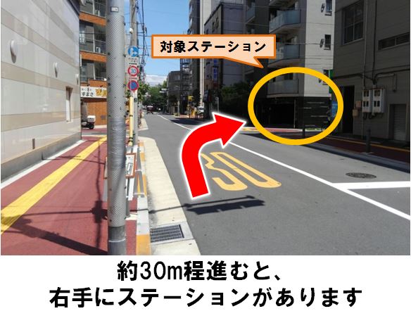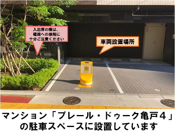 【ご注意】前面歩道の歩行者やマンション利用者にご注意ください。「亀戸駅」北口より徒歩約3分、マンション「プレール・ドゥーク亀戸4」の駐車スペースに設置しています。※当ステーションへの順路は、ステーションフォトギャラリーをご確認ください。
