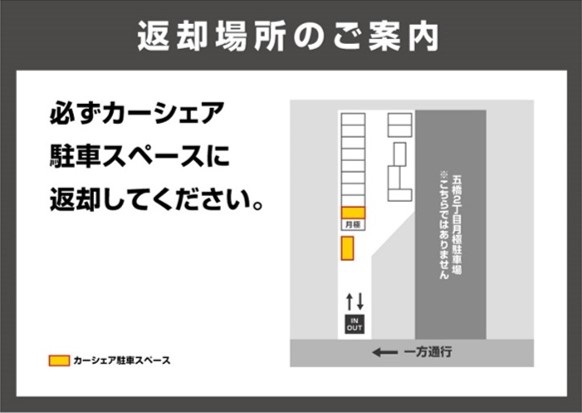 【お願い】・ご自身のカーシェアご返却時に誤駐車車両があった場合、コンタクトセンターへのご連絡などでお手数をおかけしてしまう可能性がございますので、ご協力をお願い致します。※駐車場前面道路は一方通行のため、出庫時は右折してください。・次の方が気持ちよく利用できるよう、車内で出た飲み物・食べ物などのゴミは、必ず各自でお持ち帰りください。またクルマにある掃除用品をご利用いただき、車内美化にご協力ください。