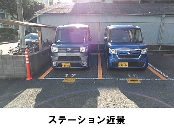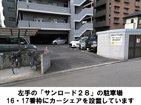 接道は一方通行ですのでご注意ください。自転車でお越しの場合は近隣の駐輪場をご利用ください。「豊里三角公園」より徒歩約1分、マンション「サンロード28」の駐車場16番・17番枠に設置しています。※当ステーションへの順路はステーションフォトギャラリーをご確認ください。※当ステーションは、スタンド看板は設置しておりません。