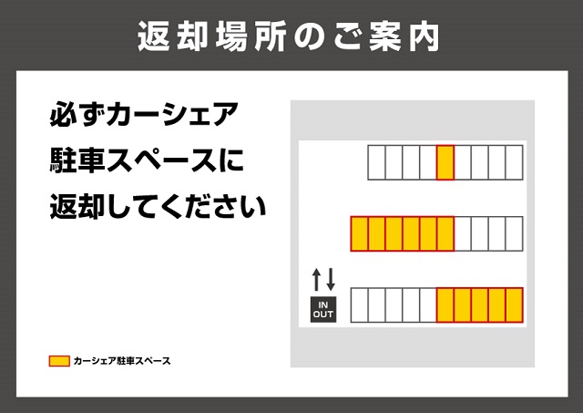★★★ご注意ください★★★当ステーションは34・35・49・50・51・52・53番の枠に駐車スペースがあります。49から53番だけ駐車場入口入って右の一番奥にあります。ご注意ください。カーシェア駐車スペース以外は駐車禁止です。ライトの消し忘れが多発しております。返却の際は消し忘れにご注意ください。