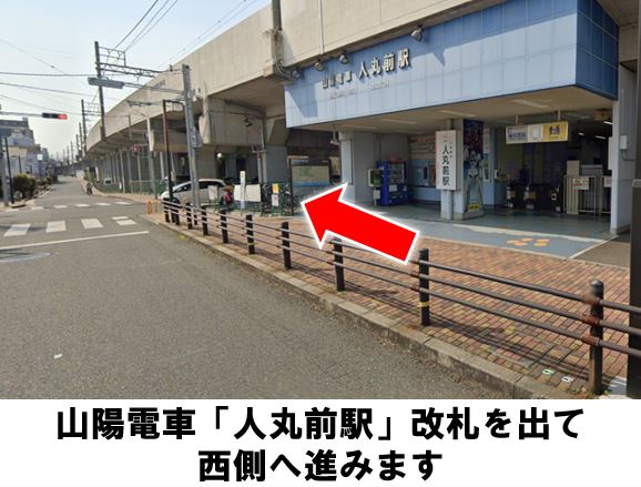 予約登録完了メールとは別に、車種・ナンバーは利用開始時間の約20分前にメールでお知らせします。車両をお知らせするメールが届いた後、変更できる項目が限られます。(返却予定日時、安心補償サービス、追加運転者、カーシェアeチケットのみ)※安心補償サービスは利用開始以降変更できません。他の項目を変更される場合は、一旦取り消しをして、再度ご予約をお願いしておりますが、その際にも車両準備時間が必要となります。【ご注意】当ステーションの前面道路は、一方通行のためご注意ください。山陽電車「人丸前駅」より徒歩約1分、高架下駐車場のNo.41に設置しています。※当ステーションへの順路はステーションフォトギャラリーをご確認ください※当ステーションは、スタンド看板を撤去しています