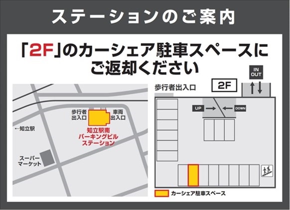【ご注意】当駐車場のステーションは駐車位置が2F・3F・4Fの3箇所に分かれています。ご返却の際は、必ず貸出時と同じ場所にお戻しください。名鉄名古屋本線「知立駅」より徒歩約2分です。