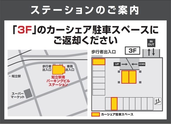 【ご注意】当駐車場のステーションは駐車位置が2F・3F・4Fの3箇所に分かれています。ご返却の際は、必ず貸出時と同じ場所にお戻しください。名鉄名古屋本線「知立駅」より徒歩約2分です。