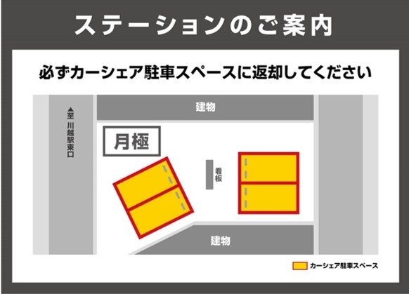 【通行規制あり】当ステーションは下記時間帯において前面道路に時間規制があります。規制時間:土・日曜、休日を除く7:30-8:30通行時は助手席前(グローブボックス内)に入っている通行許可証を車両前面の見やすい箇所に掲示し、通行人等に十分ご注意の上走行してください。【アクセス】JR川越線・東武東上線「川越駅」より徒歩約3分です。■ステーション入口は東側です。逆側からの進入はおやめください■※当ステーションへの順路はステーションフォトギャラリーをご確認ください※当ステーションは、固定式看板を設置しています