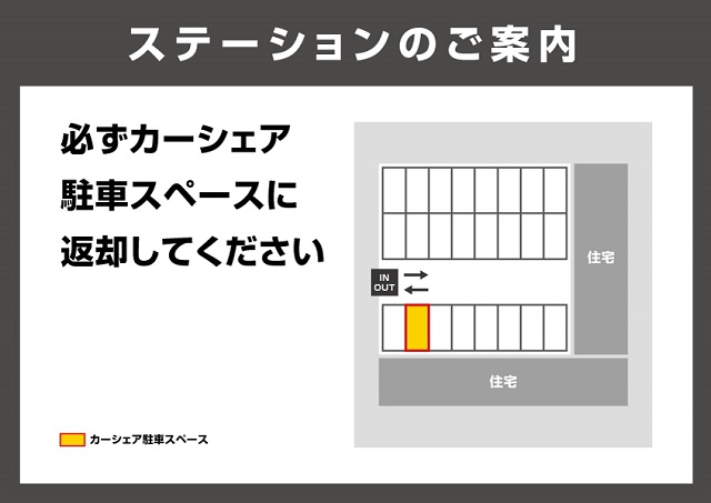 【ご利用時のお願い】※ゴミは必ずお持ち帰り下さい。駐車場内への投棄は絶対におやめ下さい。※自転車、バイクの乗り入れは禁止です。※禁煙(加熱式含む)です。【駐車時のお願い】※必ずカーシェア専用スペースに返却下さい。他の駐車スペースへの侵入、駐車はおやめ下さい。カーシェア専用スペースは黄色いライン、黄色いプレート看板が目印です。※駐車時は車止めまでしっかりと止めて下さい。前方へのはみ出しにご注意ください。※隣の駐車スペースへのはみ出しての駐車は絶対にしないでください。※誤駐車、はみ出し駐車のトラブルが多発しています。万一、他のスペースへの駐車、はみ出し駐車を発生させた場合、移動に要した費用を請求させていただきます。【ご案内】JR鴻巣駅より徒歩約3分です。※当ステーションへの順路はステーションフォトギャラリーをご確認ください
