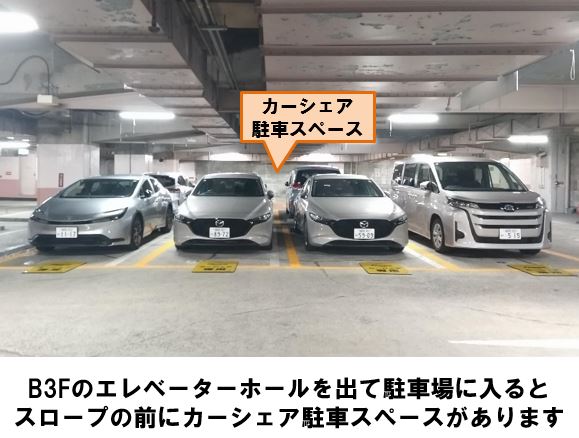 【ご注意】入出庫の際は、精算ゲートでは駐車券は取らず、バイザーに備え付けの「駐車パスカード(定期券)」をご利用ください。カーシェア専用駐車スペース以外には駐車できませんので、必ず元の場所にお戻しください。「博多駅前3」交差点より徒歩約5分、「ANAクラウンプラザホテル福岡」地下3階駐車場に設置しています。※当ステーションへの順路はステーションフォトギャラリーをご確認ください
