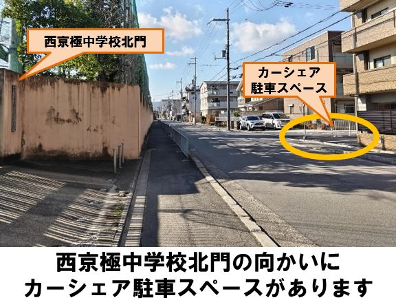 【ご注意】本ステーションの西隣に西京極中学校北ステーションがございます。返却時はお間違えのないよう、貸出時と同じ場所にお戻しください。入出庫の際は歩行者に十分ご注意ください。ルールやマナーをお守りいただけない場合、調査の上、警告や退会処分等の対応をおこなう場合があります。ステーションへのバイク・自転車の乗り入れは禁止しております。ゴミは必ずお持ち帰りください。西京極中学校北門より徒歩約1分です。※当ステーションへの順路はステーションフォトギャラリーをご確認ください