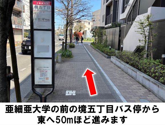 亜細亜大学の前にある境五丁目バス停より徒歩約1分です。