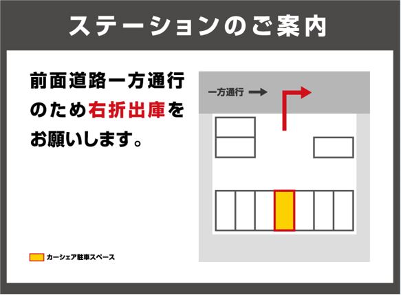 【通行規制あり】※当ステーションは下記時間帯において前面道路に時間規制があります。規制時間:土・日曜・休日を除く7:30-8:30通行時は助手席前(グローブボックス内)に入っている通行許可証を掲示し、通行人等に十分ご注意の上走行してください。※前面道路は一方通行です。出庫時は右折でお願いします。※住宅地ですので、ご利用の際はお静かにお願いします。