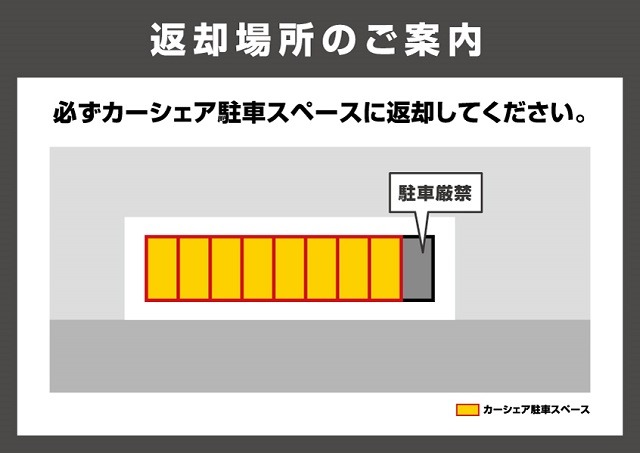 カーシェア専用駐車スペース以外には駐車できませんので、必ず元の場所にお戻しください。No.11区画は一般の月極区画ですので駐車厳禁です。