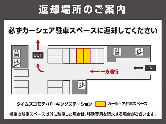 【ご注意】駐車場内は一方通行となります。掲示物を十分に確認の上、入出庫ください。指定の駐車スペース以外に駐車した場合は、移動費用を請求する場合がございます。また、歩行者や自転車、場内設備に十分注意し、必ず徐行運転ください。※当ステーションへの順路は、ステーションフォトギャラリーをご確認ください。