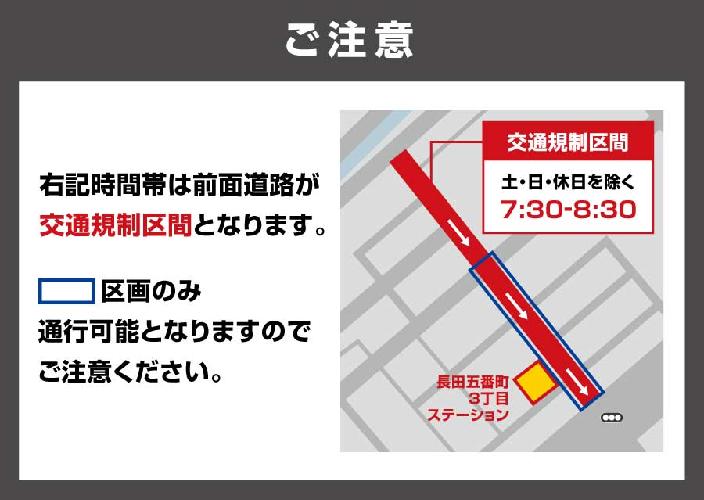 【通行規制あり】当ステーションの前面道路は、通学路として子どもの安全を守るため、下記時間帯に歩行者専用となっており規制があります。規制時間:7:30-8:30(土曜・日曜・休日を除く)通行人に十分注意し、必ず徐行して走行ください。※兵庫県は通行を許可されている区間を走行する時に通行許可証の掲示は不要です。通行許可証は車検証ケースに保管しております。提示を求められた際はご対応をお願いいたします。提示した通行許可証は必ず車検証ケースへお戻しください。