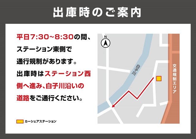 【ご案内】平日7:30~8:30の間、ステーション東側で通行規制があります。出庫時はステーション西側へ進み、白子川沿いの道路をご通行ください。